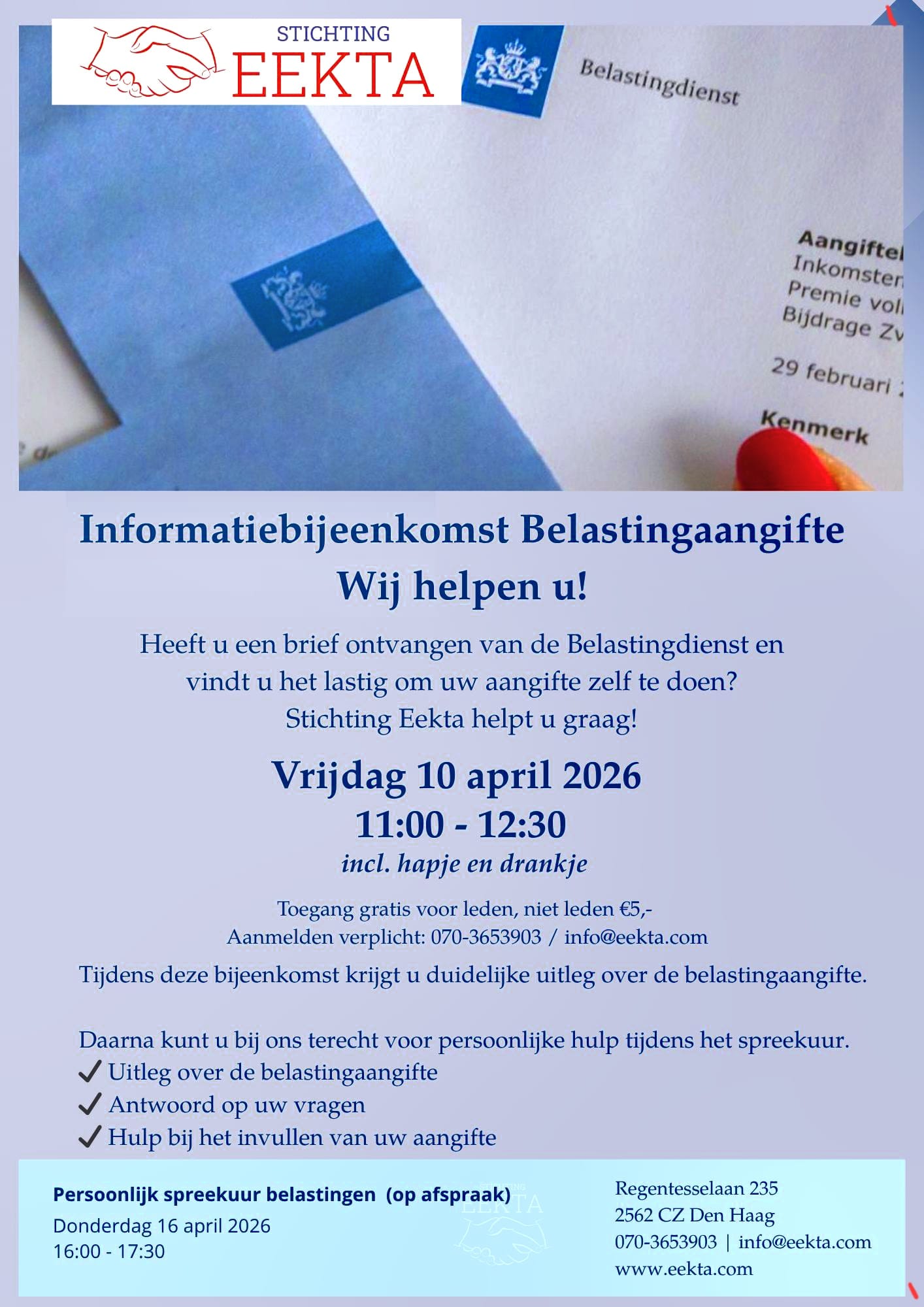 Stichting Eekta nodigt u hierbij uit voor een informatiebijeenkomst belastingaangifte, waarin alles rustig en duidelijk wordt uitgelegd. In een vertrouwde sfeer nemen we de tijd en aandacht voor uw vragen.